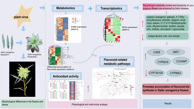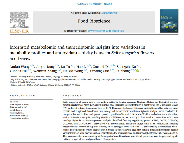近日,我校醫學院張麗副教授團隊在準噶爾柳花研究方面取得重要研究進展,研究成果以“Integrated metabolomic and transcriptomic insights into variations in metabolite profiles and antioxidant activity between Salix songarica flowers and leaves”(綜合代謝組學和轉錄組學揭示準噶爾柳花和葉之間代謝物譜和抗氧化活性的變化)發表在農林科學領域TOP期刊Food Bioscience上(中國科學院一區,IF=4.8)。準噶爾柳(S.songarica)是原產于中亞和中國新疆的珍稀柳樹,具有重要歷史和藥用意義。當準噶爾柳幼枝受到植物病毒感染后,準噶爾柳葉(“Y”)聚集形成準噶爾柳花(“H”)。然而,它們之間的生物活性和代謝物譜仍未得到充分探索。因此,為了解決這一問題,該研究進行了非靶向代謝組學和轉錄組學分析,以比較H和Y的代謝物和基因表達譜。總共鑒定了1322種代謝物,多變量分析顯示了顯著差異,特別是在類黃酮積累方面,類黃酮含量在H中明顯增加。轉錄組分析確定了五個關鍵調控基因——CAD9、OMT1、CYP92C6、CCOAMT和CYP73A100——與H中增強的類黃酮生物合成相關。此外,抗氧化能力測定證實了H中的優異抗氧化活性,且與12種差異積累的類黃酮密切相關。這些發現表明,H中類黃酮水平的升高可能是一種針對植物病毒感染的防御機制。同時,也為H和Y之間代謝物組成和功能差異提供了重要的見解。此外,該研究的發現增強了對準噶爾柳的藥用和營養特性的理解,以及拓展了其在食品和植物療法中潛在應用的視野。