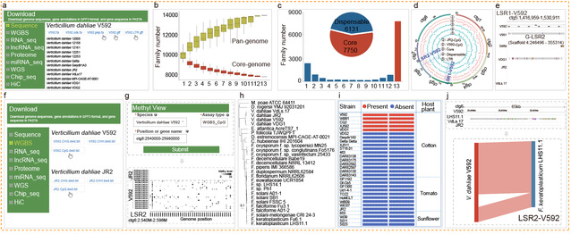 該數據庫收集了目前相關的所有多組學數據,包括基因組、轉錄組、蛋白組、代謝組、甲基化組、非編碼RNA等在內的所有已公開的和自測的3000+樣本數據,總的數據量超過了6.5T。收集和整理了已鑒定的黃萎病相關的242個真菌基因和565個寄主植物基因。開發內置了包括在線差異分析和GO/KEGG富集分析在內的14個在線分析工具,并支持使用者上傳自己的組學數據進行分析,是數據收集、分析、可視化于一體的綜合數據庫(圖2)。