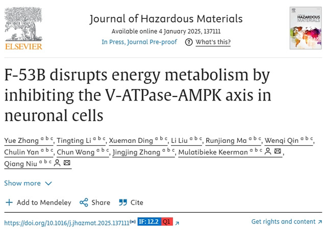 6:2氯多氟辛烷醚磺酸鹽(F-53B)作為新型有機污染物全氟辛基磺酸的替代品,在環境和生物樣本中被廣泛發現,對機體的健康危害不容忽視。近日,石河子大學醫學院預防醫學系牛強教授課題組在F-53B對神經毒性機制的研究中取得重要進展,相關研究成果已被環境科學與生態學領域內TOP期刊《Journal of Hazardous Materials》(中國科學院1區,IF=12.2)接收。