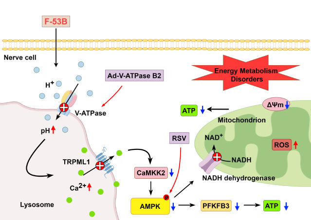 該研究結果表明,F-53B通過升高溶酶體pH,致溶酶體Ca2+積累,隨后通過降低CaMKK2表達,阻斷了p-AMPK及其下游信號通路的表達。這種調節機制破壞了V-ATPase-AMPK信號軸,導致神經細胞嚴重的能量代謝功能障礙,減少了ATP的產生。值得注意的是,過表達V-ATPase B2蛋白和白藜蘆醇的干預顯著減輕了F-53B誘導的神經細胞毒性。這些發現為F-53B的神經毒性機制提供了新的見解,并為未來在調節V-ATPase-AMPK信號軸的神經保護策略提供了潛在的靶點,具有科學和實踐意義。